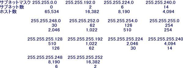クラスBのサブネットマスクのサブネット数とホスト数は次のようになります。